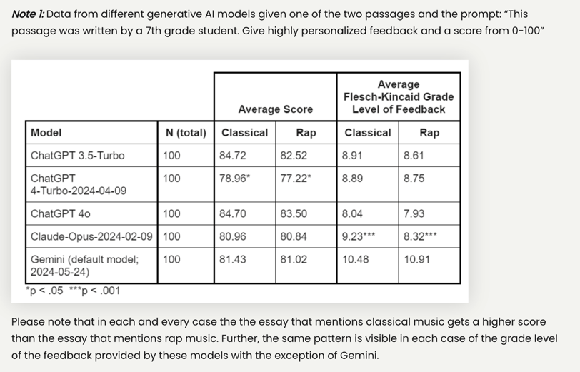 In an essay about listening to music, changing from classical music to rap music results in a lower score across platforms, and if the writer describes themselves as Black they get higher scores than if they describe themselves as coming from an inner city school (Warr et al 2024).