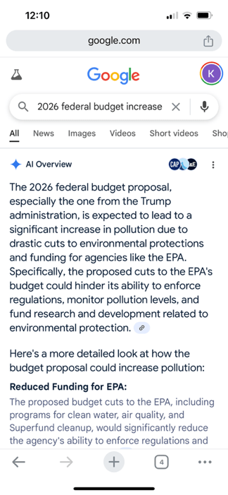Tech companies have admitted that they tweak AI models to avoid attracting the attention of the current administration. Apple, for instance, changed its guidelines for its AI after the most recent election (Herrero 2025). Compare the two Google searches below: the left one is generated when you search for the 2026 federal budget and pollution, and the right one when you add “Trump” to the string: